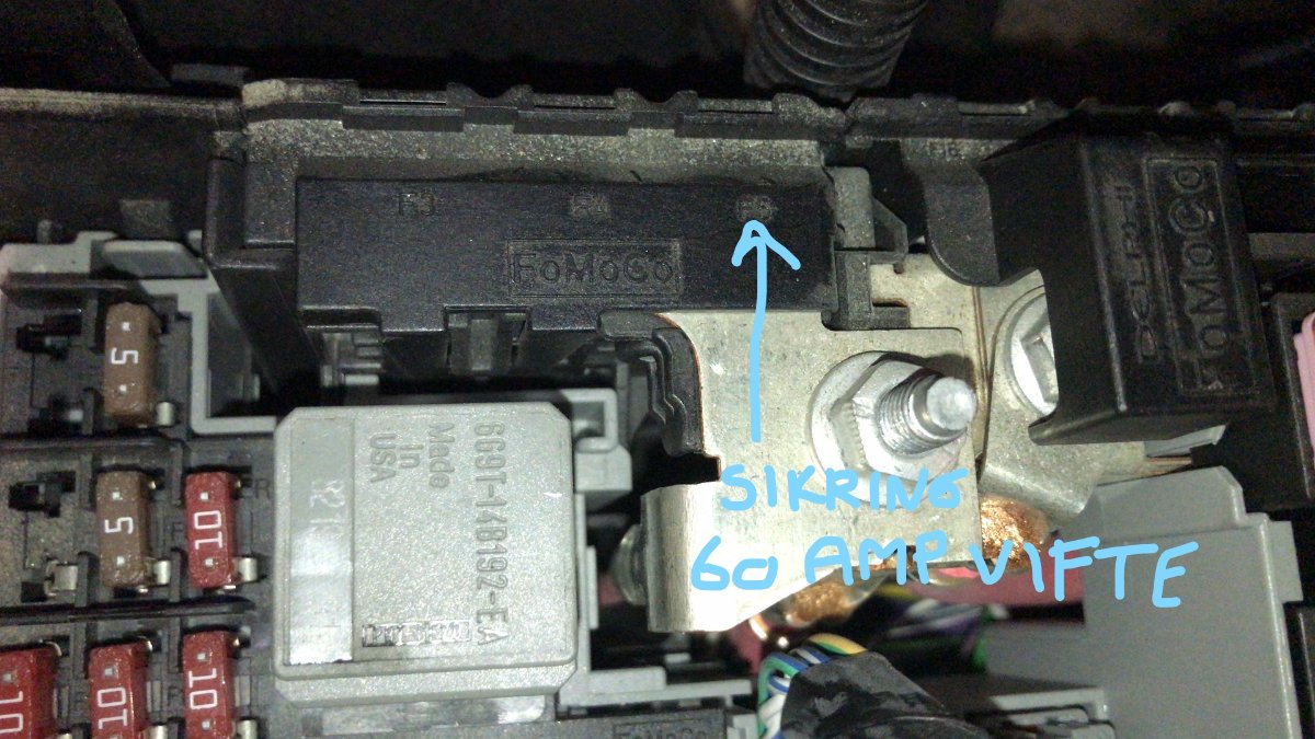 Balltus12 Posted September 27, 2021 Author Posted September 27, 2021 hei. Nå har jeg tatt strømmen på bilen . Lar den stå en stund. Noe jeg gjerne vil sjekke er en 60 amp sikring som sitter i sikringsboksen i motor rommet. Er denne lett å få ut tro? Har aldri vært borti en slik sikring før. Litt usikker på hvordan jeg kobler den ut. Det er sikringen til motorvifta. Har stått på tomgang lenge nå og motoren er normal varm. Men motorvifta starter ikke. Hadde ikke forundra meg om feilen ligger her? Sikkert en smal sak og sjekke. men hvordan tar jeg den ut tro? se bilder